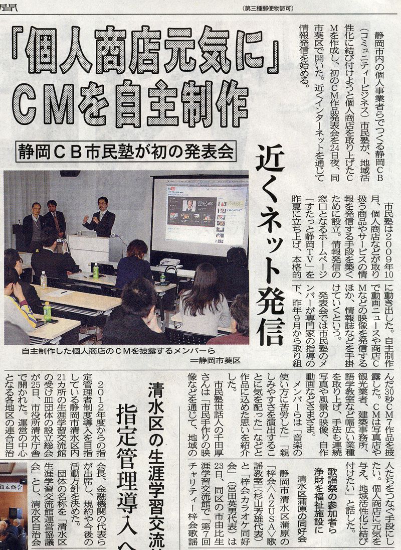 2011年1月24日に行われた、静岡CB市民塾の『しぞおか映像制作講習会CM発表会』の様子と、エーハーフ制作・運営『すたっと静岡TV』が、2011年1月26日の静岡新聞朝刊に掲載されました。